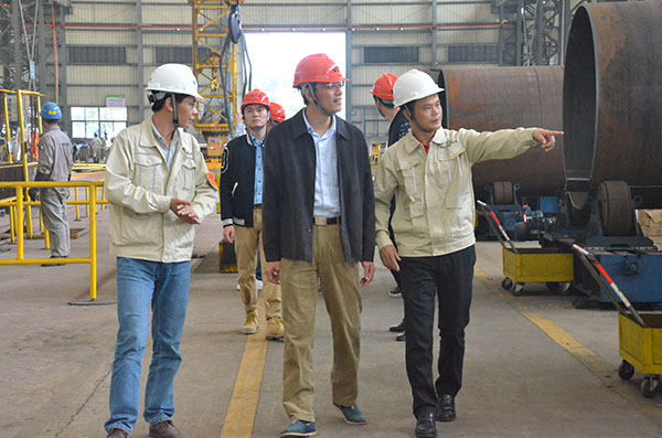 在郑总、郭总、翁总的陪同下,林巍行长一行人参观了公司生产车间、涂装车间,并感慨道:“先前来到福船一帆还是100多亩的施工新建厂房,如今已经成为拥有800多亩厂区,同时配套各种高精生产设备、重型起吊转运设备,交通便利具有一定实力的国有混合制企业”。林行长对福船一帆的跨越式发展感到欣喜。